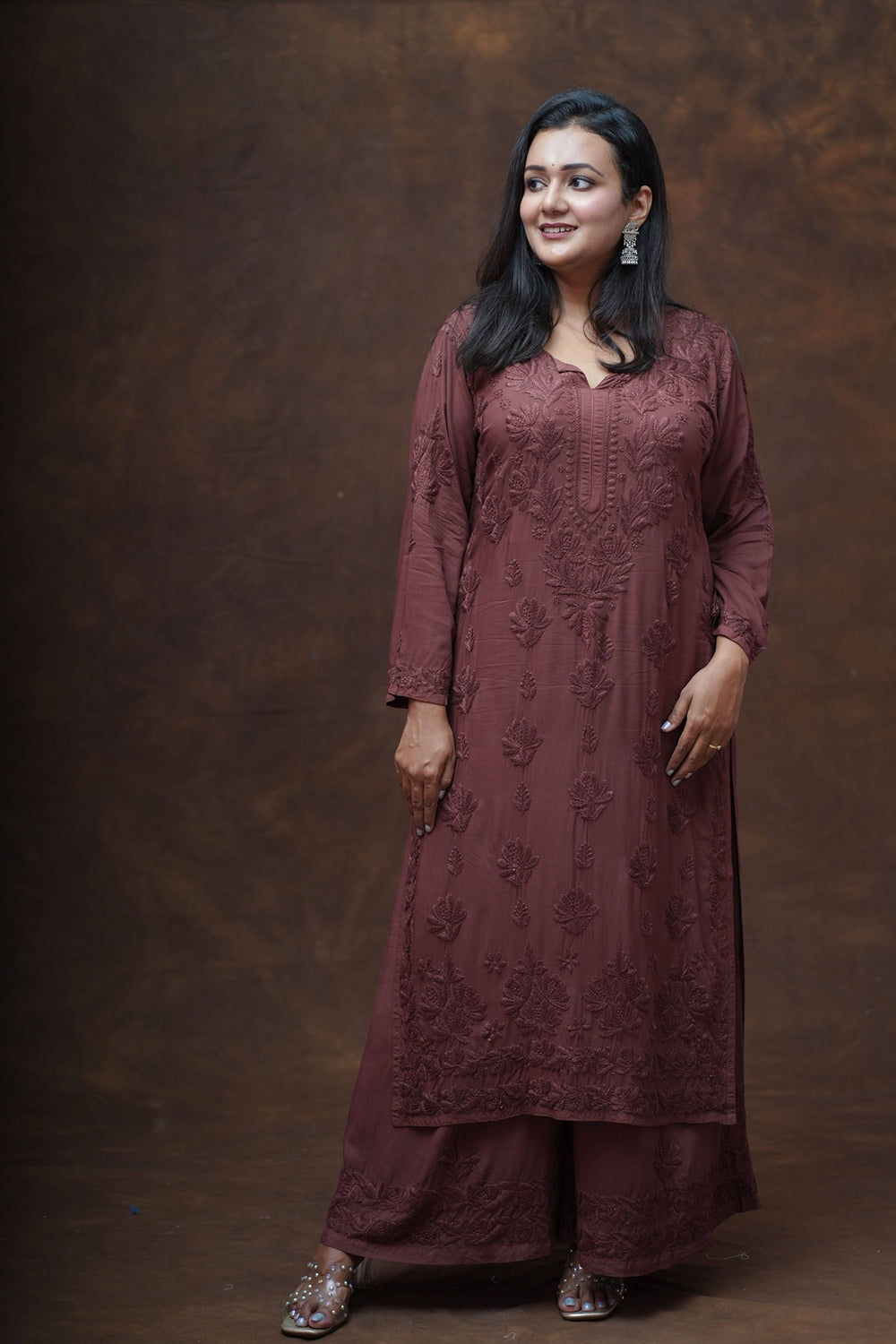 This stunning Brown Chikankari Kurta and Palazzo Set in luxurious Modal Fabric beautifully combines tradition with modern elegance.