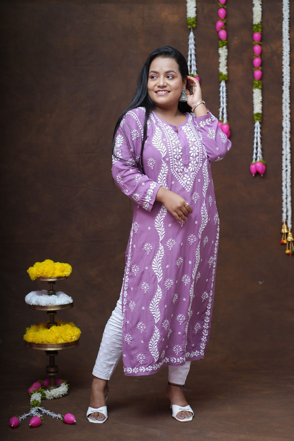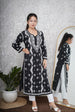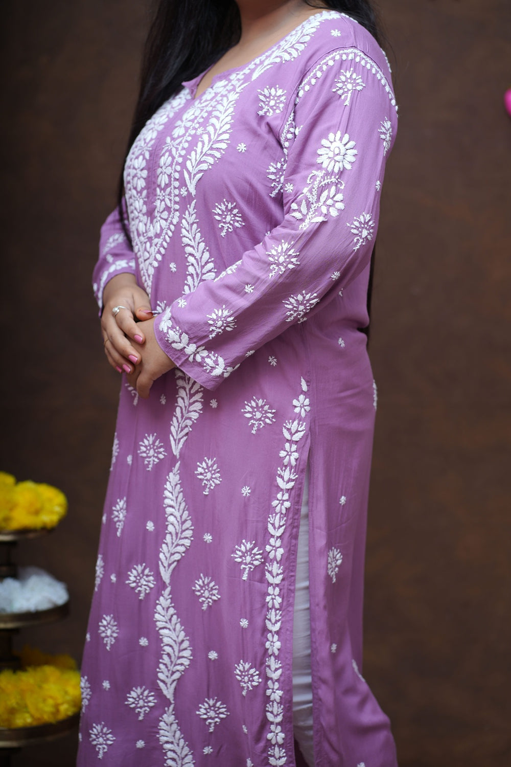 It features intricate chikankari embroidery in contrasting thread, beautifully arranged in floral and leafy patterns that run vertically down the front and adorn the sleeves and hemline, creating a harmonious and elegant design.