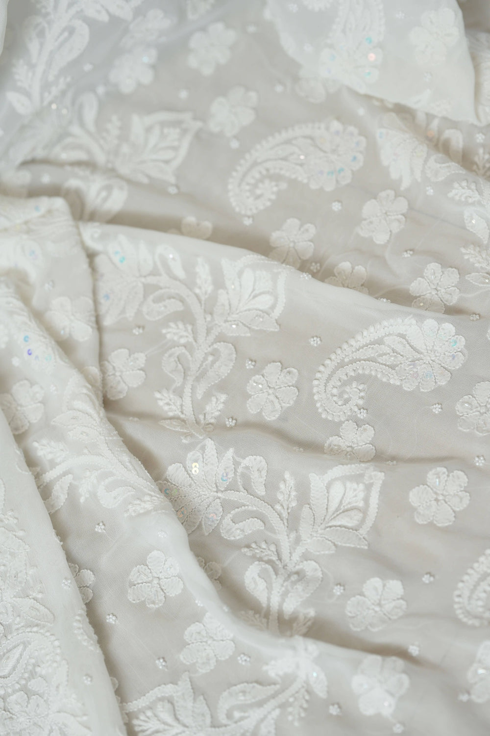 Delicately detailed with fine Chikankari embroidery, the saree showcases intricate patterns brought to life with shimmering pearls, cutdana, and sequin accents. Each element is thoughtfully placed to create a soft interplay of texture and light, lending the saree an ethereal sparkle without overpowering its purity. The pristine white tone enhances its refined charm, making it an elegant choice for women who appreciate understated glamour and artisanal finesse. Paired with a coordinating blouse piece, it offers endless styling possibilities for both classic and contemporary looks."