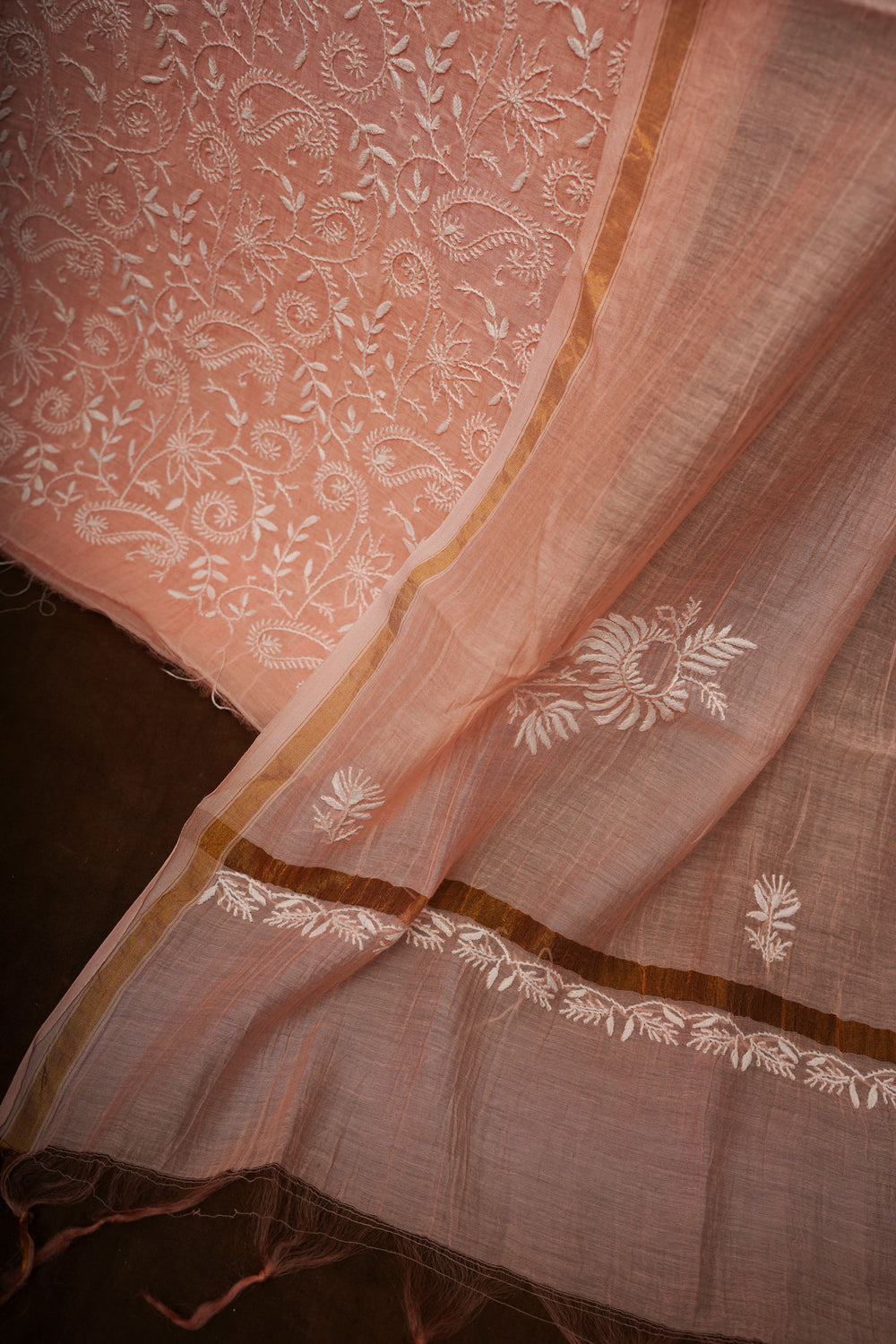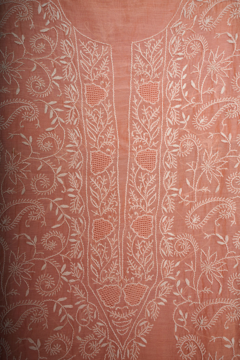 Mul Cotton- Chikankari Unstitched 3 Pc Suit Set with Jaali -Peach