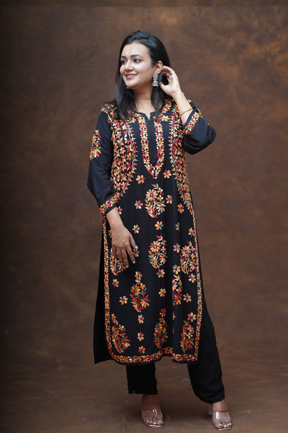Varnika Rayon Multicolour Thread Chikankari Kurta-Black